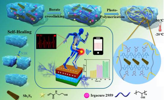 采取了一种经典的双网络结构设计策略,通过精心设计的合成路线,将Sb2S3@PPy-DA纳米复合材料与PVA/PHEAA基质结合,形成了目标SPOH凝胶。这种水凝胶在近红外光照射下能够快速自愈合,且不影响未受损区域的性能。此外,Sb2S3@PPy-DA的引入不仅增强了水凝胶的机械性能,还提高了其导电性,从而增强了传感灵敏度。这项工作通过开发一种近红外光诱导的快速自愈合水凝胶,为制造高性能、耐用且具有自修复能力的柔性电子设备和可穿戴传感器提供了一种创新的材料解决方案,推动了智能穿戴技术和健康监测设备的发展。