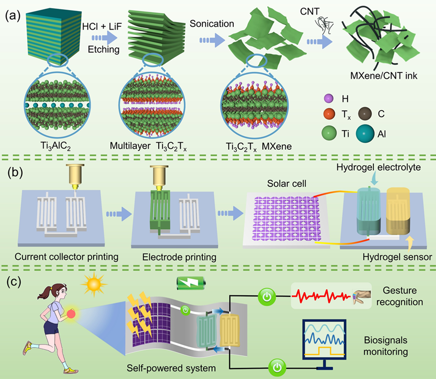 随着智能电子和物联网时代的到来,微型储能设备在柔性可穿戴健康监测器件、机器人和植入式医疗传感器等领域逐渐发挥重要作用。其中,微型超级电容器(MSCs)是一类电极在同一平面内呈周期性叉指状图案排列的储能设备,具有功率密度高、循环寿命长和电子/离子扩散路径可控等优势。3D打印技术可以实现电容器电极的几何形状精确定制,获得高度集成的MSCs储能器件,较大程度节约成本。然而,MSCs的规模化应用仍严重受限于可适用3D打印的高性能可印刷电极材料墨水。Ti3C2Tx-MXene在水溶剂中具有的良好的分散性和优异的物理化学性质,可作为3D打印墨水制备MSCs。然而,寻找不含添加剂的环保水性Ti3C2Tx-MXene基油墨,并防止MXene纳米片在高浓度油墨中严重堆叠团聚,仍然是重大挑战。针对该问题,湖南工业大学材料与先进制造学院李娜教授课题组联合湖南工业大学生物与医学工程学院许建雄教授,温州大学王正军博士开发了一种无添加剂、高度可印刷、粘度可调且环保的MXene/碳纳米管(CNT)复合墨水。优化后的复合油墨可以通过3D打印技术在柔性基材上迅速构筑叉指结构微电极,展现出优异的集成灵活性。相关工作以“Additive-Free Ti3C2Tx MXene/Carbon Nanotube Aqueous Inks Enable Energy Density Enriched 3D-Printed Flexible Micro-Supercapacitors for Modular Self-Powered Systems”为题于2025年3月发表在中国英文科技期刊《碳能源》(《Carbon Energy》,中科院一区,IF=19.5)上。论文通讯作者是湖南工业大学李娜教授、许建雄教授,温州大学王正军博士,第一作者是湖南工业大学材料科学与工程学院2022级硕士研究生周云龙。