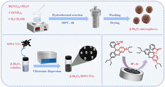 用于RhB测定的β-Bi2O3/MWCNT/GCE制备示意图