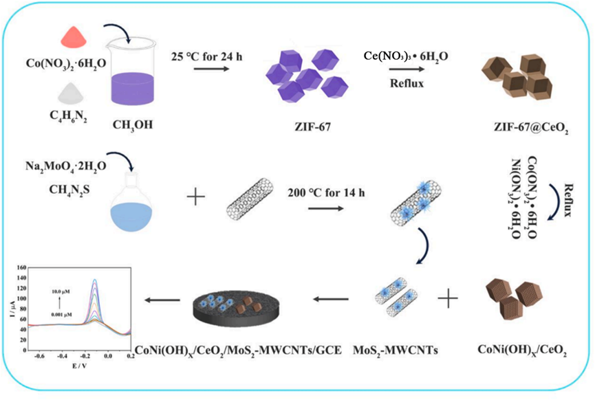 在本文中,通过以ZIF-67为前驱体的两步回流工艺成功实现了MOF衍生纳米复合材料CoNi-ZIF-67/氧化铈的原位合成。此外,我们将该纳米复合材料与通过超声波水热法制备的MoS2-MWCNTs纳米材料结合,最终获得了可直接检测CoNi(OH)x/CeO2/MoS2-MWCNTs/GCE电极材料中甲基对硫磷含量的电极材料。首先,我们对制备的CoNi(OH)x/CeO2/MoS2-MWCNTs/GCE电极材料的形貌、晶体结构和元素组成进行了详细表征。通过扫描电子显微镜(SEM)观察发现,该电极材料具有独特的纳米结构,为其在电化学传感中的应用提供了理想条件。同时,XRD分析表明材料的晶体结构清晰且与预期成分一致。此外,EDS和EIS进一步证实了材料中元素的分布及电学性能。基于优化的实验条件,我们进一步探索了CoNi(OH)x/CeO2/MoS2-MWCNTs/GCE传感电极对甲基对硫磷的线性响应范围。根据上述实验结果可知,电极响应与甲基对硫磷浓度在1.0至10.0 μM范围内呈现显著线性关系,其线性回归方程为ip = 4.869c + 47.93,相关系数R²高达0.9855。在更低浓度范围(0.001-1.0μM)内,电极同样表现出高灵敏度,线性回归方程为ip = 28.96c + 16.46,R²值为0.9818。值得一提的是,该传感器的检测下限达到0.1 nM,相较于其他甲基对硫磷检测方法具有显著性能优势。为验证传感器的实际应用价值,我们将其应用于实际样品检测。实验结果表明,该传感器在实际样品中甲基对硫磷检测具有高准确性和可靠性,回收率范围在98.4 %至108 %之间。此外,我们还测试了传感器的选择性、稳定性、重复性和再现性,结果表明该传感器在这些方面均表现出优异性能。
